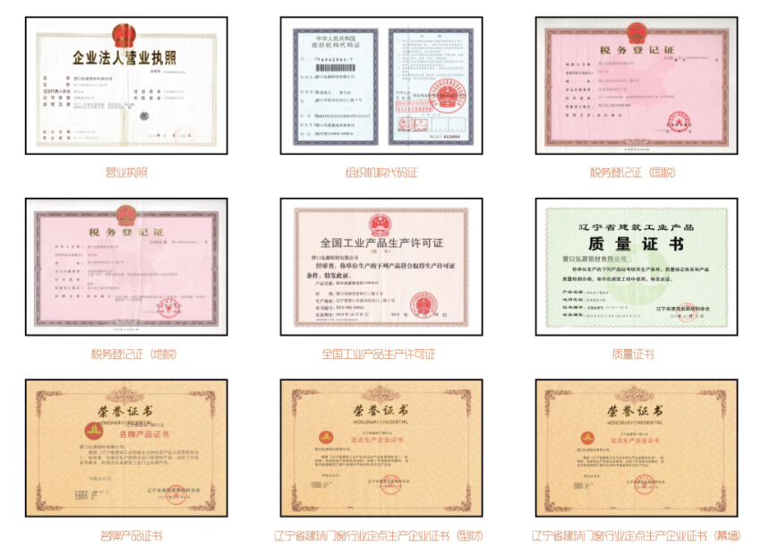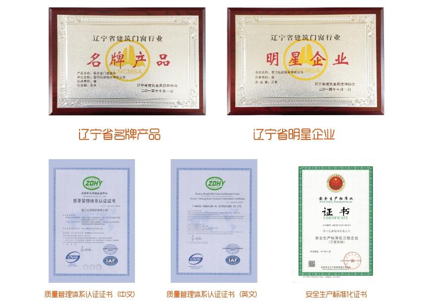 2014年,遼寧省建筑金屬結構協會頒發遼寧省建筑門窗行業“名牌產品證書”、“明星企業證書”、鋁合金型材、鋁合金幕墻“定點生產企業證書”;